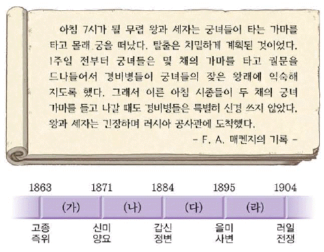 '아침 7시가 될 무렵 왕과 세자는 궁녀들이 타는 가마를 타고 몰래 궁을 떠났다'는 내용이 나와 있다. 이어 '탈출은 치밀하게 계획된 것이었다. 1주일 전부터 궁녀들은 몇 채의 가마를 타고 궐문을 드나들어서 경비병들이 궁녀들의 잦은 왕래에 익숙해지도록 했다. 그래서 이른 아침 시종들이 두 채의 궁녀 가마를 들고 나갈 때도 경비병들은 특별히 신경 쓰지 않았다'는 내용이 나와 있다. 마지막으로 '왕과 세자는 긴장하며 러시아 공사관에 도착했다'는 내용이 나와 있다. 특히 마지막 문장을 통하여 제시된 자료 속 사건은 1896년 2월 11일 고종이 러시아 공사관[아관]으로 처소를 옮긴 아관 파천임을 알 수 있다. 연표에서는 1895년 을미 사변과 1904년 러일 전쟁 사이인 (라) 시기에 해당한다.