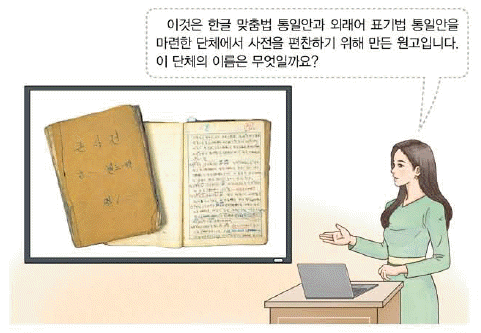 '이것은 한글 맞춤법 통일안과 외래어 표기법 통일안을 마련한 단체에서 사전을 편찬하기 위해 만든 원고이다'는 내용이 나와 있다. 이를 통해 제시된 '단체'의 이름은 조선어 학회임을 알 수 있다. 주지하듯이 조선어 학회는 1931년 11월 조선어 연구회가 명칭을 변경한 것이다.