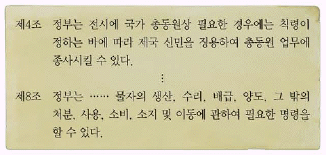 제4조로 ' 정부는 전시에 국가 총동원상 필요한 경우에는 칙령*이 정하는 바에 따라 제국 신민을 징용하여 총동원 업무에 종사시킬 수 있다'는 내용이 나와 있다. 이어 제8조로 '정부는 ······ 물자의 생산, 수리, 배급, 양도, 그 밖의 처분, 사용, 소비, 소지 및 이동에 관하여 필요한 명령을 할 수 있다'는 내용이 나와 있다. 이를 통해 제시된 법령은 일제의 국가 총동원법임을 알 수 있다(1938.4).