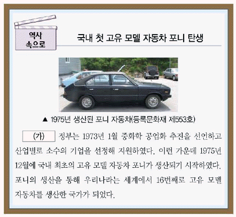'국내 첫 고유 모델 자동차 포니 탄생'이라는 제목하에 '(가) 정부는 1973년 1월 중화학 공업화 추진을 선언하고 산업별로 소수의 기업을 선정해 지원하였다'는 내용이 나와 있다. 이어 '이런 가운데 1975년 12월에 국내 최초의 고유 모델 자동차 포니가 생산되기 시작한 바 포니의 생산을 통해 우리나라는 세계에서 16번쨰로 고유 모델 자동차를 생산한 국가가 되었다'는 내용이 나와 있다. 이를 통해 제시된 '(가) 정부'는 박정희 정부임일 알 수 있다.
