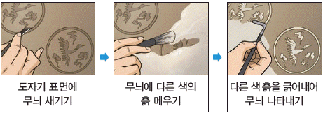 '도자기 표면에 무늬 새기기'를 하고, 그 다음 '무늬에 다른 색의 흙 메우기'를 하며, 마지막으로 '다른 색 흙을 긁어내어 무늬 나타내기' 작업이 차례대로 제시되어 있다. 이른바 '상감 기법'으로, 12세기 중엽부터 발달하기 시작한 상감 청자를 가리키는 것임을 알 수 있다.