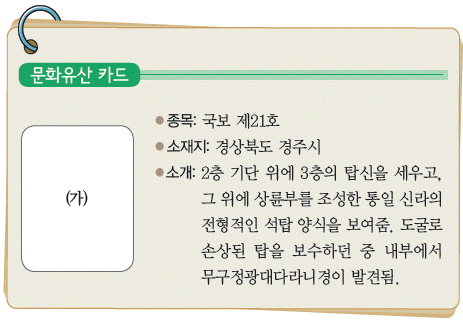 '국보 제21호'로 '경상북도 경주시'에 소재하며 '2층 기단 위에 3층의 탑신을 세우고, 그 위에 상륜부를 조성한 통일 신라의 전형적인 석탑 양식을 보여주는' 것으로 나와 있다. 이어 '도굴로 손상된 탑을 보수하던 중 내부에서 무구정광대다라니경이 발견'되었다. 이를 통해 제시된 '(가)'는 경주 불국사 삼층 석탑, 즉 석가탑임을 알 수 있다(751, 경덕왕 10).