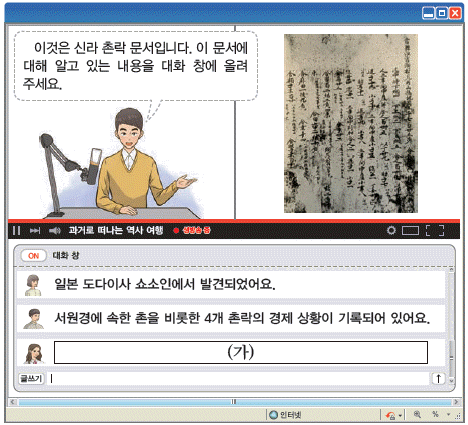 '이것은 신라 촌락 문서이다. 이 문서에 대해 알고 있는 내용을 대화 창에 올려 달라'는 요청이 나와 있다. 이어 대화 창에 '일본 도다이사 쇼소인에서 발견되었다'는 답변(1933년에 발견), '서원경에 속한 촌을 비롯한 4개 촌락의 경제 상황이 기록되어 있다'는 답변이 제시되어 있다.
