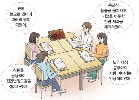 '원에 볼모로 갔다가 고려의 왕이 되었다'는 점, '몽골식 풍습을 금지하고 기철을 비롯한 친원 세력을 제거하였다'는 점, '신돈을 등용하여 전민변정도감을 설치하였다'는 점, '노국 대장 공주와의 사랑 이야기가 인상적'이라는 점이 제시되어 있다. 이를 통해 학생들이 공통으로 이야기하고 있는 왕은, 고려의 제31대 왕인 공민왕(재위 1351-1374)을 가리킴을 알 수 있다.