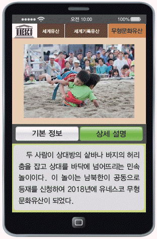 '두 사람이 상대방의 샅바나 바지의 허리춤을 잡고 상대를 바닥으로 넘어뜨리는 민속놀이이다'는 내용이 나와 있다. 이어 '이 놀이는 남북한이 공동으로 등재를 신청하여 2018년에 유네스코 인류 무형 문화유산이 되었다'는 내용이 나와 있다. 이를 통해 제시된 문화유산은, '민속놀이 씨름'임을 알 수 있다.