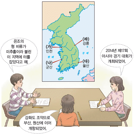 왼쪽 말풍선에 '온조의 형 비류가 미추홀이라 불린 이 지역에 터를 잡았다'는 내용이 나와 있다. 가운데 말풍선에는 '강화도 조약으로 부산, 원산에 이어 개항되었다(1883, 고종 20)'는 내용이 나와 있다. 마지막으로 맨오른쪽 말풍선에는 '2014년 제17회 아시아 경기 대회가 개최되었다(2014.9.19~10.4)'는 내용이 나와 있다. 이를 통해 학생들이 공통으로 이야기하고 있는 지역은 '인천(광역시)'임을 알 수 있다.