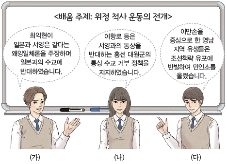 '위정척사 운동의 전개'라는 제목 아래, 맨왼쪽 말풍선에 '최익현(1833~1907)이 일본과 서양은 같다는 왜양일체론을 주장하며 일본과의 수교에 반대하였다'는 내용이 나와 있다. 1870년대의 개항 반대 운동을 가리킨다[(가)]. 가운데 말풍선에는 '이항로(1792~1868) 등은 서양과의 통상을 반대하는 흥선 대원군의 통상 수교 거부 정책을 지지하였다'는 내용이 나와 있다. 1860년대의 통상 반대 운동을 가리킨다[(나)]. 마지막으로 맨오른쪽의 말풍선에는 '이만손을 중심으로 한 영남 지역 유생들이 조선책략 유포에 반대하여 만인소를 올렸다'는 내용이 나와 있다(영남만인소, 1881.2). 1880년대의 개화 반대 운동을 가리킨다[(다)].