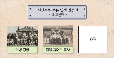 '사진으로 보는 일제 강점기 -1910년대'라는 제목 아래 '헌병 경찰'과 '칼을 휴대한 교사' 사진이 제시되어 있다. 모두 1910년대 일제의 '무단 통치 정책'과 관련된 것들이다. 주어진 선지 중에서는 '토지 조사 사업'이 해당한다(1910~1918).