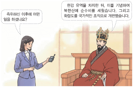 왼쪽 말풍선에 '즉위하신 이후에 어떤 일을 하셨나요?'는 질문이 나와 있다. 오른쪽 말풍선에는 '한강 유역을 차지한 뒤, 이를 기념하여 북한산에 순수비를 세웠습니다. 그리고 화랑도를 국가적인 조직으로 개편했습니다'는 내용이 나와 있다. 북한산에 순수비가 세워진 것은 신라 진흥왕 16년인 555년의 일이고, 화랑도가 국가적인 조직으로 개편된 것은 진흥왕 37년인 576년의 일이다.