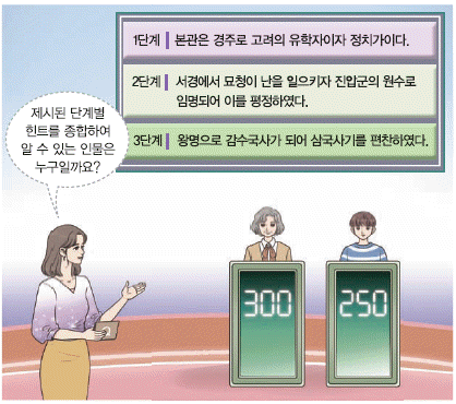 '제시된 단계별 힌트를 종합하여 알 수 있는 인물은 누구일까요?'라는 질문이 나와 있다. 이어 1단계로 '본관은 경주로 고려의 유학자이자 정치가이다'는 점, 2단계로 '서경에서 묘청이 난을 일으키자 진압군의 원수로 임명되어 이를 평정하였다'는 점, 3단계로 '왕명으로 감수국사가 되어 삼국사기를 편찬하였다'는 점이 차례로 제시되어 있다. 이를 통해 주어진 자료 속 질문에 대한 답은 뇌천 김부식(1075~1151)임을 알 수 있다. 김부식이 기전체 사서인 삼국사기 편찬을 주도한 것은 고려 인종 23년(1145년)의 일이다.