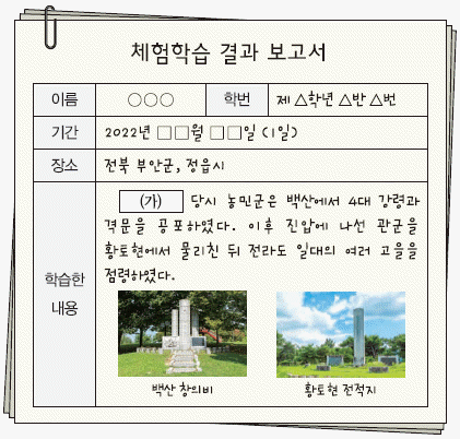 '체험학습 결과 보고서'라는 제목 아래 '전북 부안군, 정읍시'가 장소로 제시되어 있다. 이어 학습한 내용으로 '(가) 당시 농민군은 백산에서 4대 강령과 격문을 공포하였다. 이후 진압에 나선 관군을 황토현에서 물리친 뒤 전라도 일대의 여러 고을을 점령하였다'는 내용이 나와 있다. 더불어 백산 창의비와 황토현 전적지 기념비가 사진으로 제시되어 있다. 이를 통해 주어진 자료 속 '(가)'는 고종 31년인 1894년에 일어난 동학 농민 운동을 가리킴을 알 수 있다.