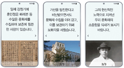 맨왼쪽에 '일제 강점기에 훈민정음 해례본 등 수많은 문화재를 수집하여 보존에 힘쓴 한 사람이 있습니다'는 내용이, 가운데에는 '가산을 탕진한다고 비난받으면서도 문화재 수집을 이어 갔고, 이를 보관하기 위해 보화각을 세웠습니다'는 내용이, 맨오른쪽에는 '그의 헌신적인 노력으로 지켜낸 우리 문화재의 소중함을 되새겨 보시기 바랍니다'는 내용이 나와 있다. 이를 통해 주어진 자료가 가리키는 인물은 간송 전형필(1906~1962)임을 알 수 있다. 전형필이 수집한 문화재는 현재 서울의 간송미술관에 전시되어 있다(서울 성북구 성북로에 위치).