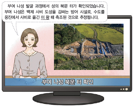 '부여 나성 북문 터 확인'이라는 제목 아래 '부여 나성 발굴 과정에서 성의 북문 터가 확인되었습니다'는 내용이 나와 있다. 이어 '부여 나성은 백제 사비 도성을 감싸는 방어 시설로, 수도를 웅진에서 사비로 옮긴 이 왕 때 축조된 것으로 추정됩니다'는 내용이 나와 있다. 백제가 수도를 웅진(충남 공주)에서 사비(충남 부여)로 옮긴 것은 성왕 16년인 538년의 일이므로, 밑줄 그은 '이 왕'은 백제의 제26대 왕인 성왕(재위 523-554)임을 알 수 있다.