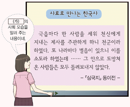 '사료로 만나는 한국사'라는 제목 아래 왼쪽 말풍선에 '(가)의 사회 모습을 알려 주는 내용이네'라는 말이 나와 있다. 이어 사료에는 '국읍마다 한 사람을 세워 천신에게 지내는 제사를 주관하게 하니 천군이라 하였다. 또 나라마다 별읍이 있으니 이를 소도라 하였는데 ······ 그 안으로 도망쳐 온 사람들은 모두 돌려보내지 않았다'는 내용이 나와 있다. 이를 통해 주어진 자료 속 '(가)'는 초기 국가, 삼한임을 알 수 있다.