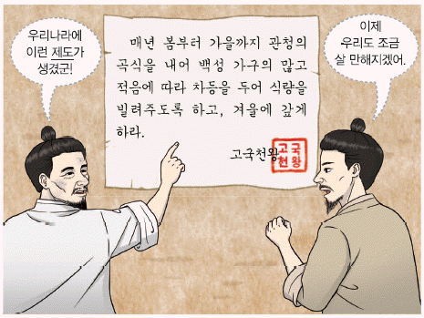 왼쪽 말풍선에 '우리나라에 이런 제도가 생겼군'이라는 말이 나와 있다. 오른쪽 말풍선에는 '이제 우리도 조금 살 만해지겠어'라는 말이 나와 있다. 가운데에는 '매년 봄부터 가을까지 관청의 곡식을 내어 백성 가구의 많고 적음에 따라 차등을 두어 식량을 빌려주도록 하고, 겨울에 갚게 하라'는 내용이 '고국천왕'의 직인과 함께 나와 있다. 이를 통해 주어진 자료에서 밑줄 그은 '제도'는 고구려의 진대법(賑貸法)임을 알 수 있다[빈민 구제책, 194(고국천왕 16)].