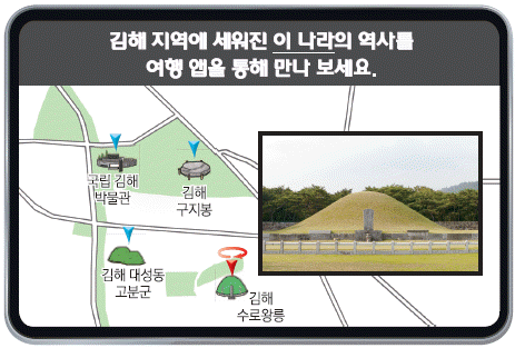 '김해 지역에 세워진 이 나라의 역사를 여행 앱을 통해 만나 보세요'라는 제목 아래 '국립 김해 박물관', '김해 구지봉', '김해 대성동 고분군', '김해 수로왕릉'이 지도 위에 표시되어 있다(김해 수로왕릉은 사진까지 제시). 이를 통해 주어진 자료 속 밑줄 그은 '이 나라'는 (김해의) 금관가야를 가리킴을 알 수 있다.