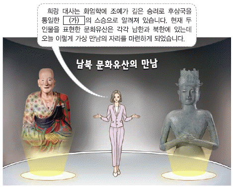 '남북 문화유산의 만남'이라는 제목 아래 '희랑 대사는 화엄학에 조예가 깊은 승려로 후삼국을 통일한 (가)의 스승으로 알려져 있습니다'는 내용이 나와 있다. 이어 '현재 두 인물을 표현한 문화유산은 각각 남한과 북한에 있는데 오늘 이렇게 가상 만남의 자리를 마련하게 되었습니다'는 내용이 나와 있다. 이를 통해 주어진 '(가)'는 고려 태조 왕건(재위 918-943)을 가리킴을 알 수 있다.