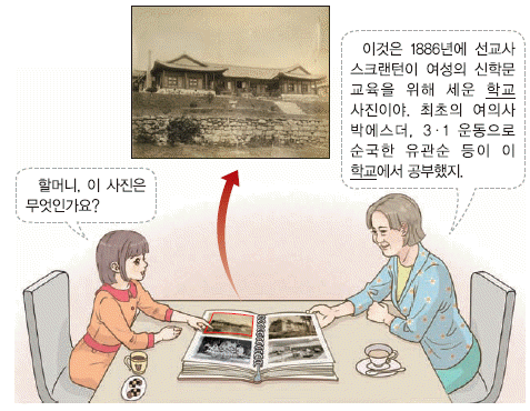 왼쪽 말풍선에 '할머니, 이 사진은 무엇인가요?'라는 질문이 나와 있다. 이어 오른쪽 말풍선에는 '이것은 1886년에 선교사 스크랜턴이 여성의 신학문 교육을 위해 세운 학교 사진이야. 최초의 여의사 박에스더, 3·1 운동으로 순국한 유관순 등이 이 학교에서 공부했지'라는 내용이 나와 있다. 이를 통해 밑줄 그은 '학교'는 이화 학당을 가리킴을 알 수 있다. 이화 학당은 1886년 5월 미국 북감리교 선교사 스트랜튼(여)(1832~1909)이 세운 초·중·고등 과정의 사립 학교이다. 우리나라 최초의 여학교이기도 하다.