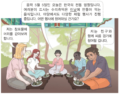 '가운데 말풍선에 '음력 5월 5일인 오늘은 한국의 전통 명절입니다. 여러분이 드시는 수리취떡은 이날에 만들어 먹는 음식입니다. 마당에서도 다양한 체험 행사가 진행 중입니다. 어떤 행사에 참여하실 건가요?'라는 질문이 나와 있다. 이어 맨왼쪽 말풍선에 '저는 창포물에 머리를 감아보려 합니다'는 말이, 맨오른쪽 말풍선에는 '저는 친구와 함께 씨름 경기에 참여할 겁니다'는 말이 나와 있다. 이를 통해 주어진 자료에서 밑줄 그은 '이날'은 세시 풍속, (5월) 단오를 가리킴을 알 수 있다. 단오는 수릿날이라고도 하며, 1년 중 양기가 가장 왕성한 날이라 여겼다. 무더위를 잘 견디라는 의미로 왕이 이날 신하들에게 부채를 선물하기도 하였다. 관련 풍속으로는 씨름, 그네뛰기, 수리취떡 만들어 먹기, 창포물에 머리 감기 등이 있다.