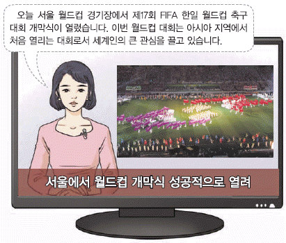'서울에서 월드컵 개막식 성공적으로 열려'라는 제목 아래 '오늘 서울 월드컵 경기장에서 제17회 FIFA 한일 월드컵 축구 대회 개막식이 열렸습니다. 이번 월드컵 대회는 아시아 지역에서 처음 열리는 대회로서 세계인의 큰 관심을 끌고 있습니다'는 내용이 나와 있다. 한국과 일본이 공동 개최한 제17회 FIFA 한일 월드컵 축구 대회가 열린 것은 2002년 5월의 일이다(2002.5.31-6.30). 그리고 이는 김대중 정부 시기(1998.2~2003.2)에 해당한다.