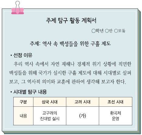 '주제 탐구 활동 계획서'라는 제목 아래 주제로 '역사 속 백성들을 위한 구휼 제도'가 나와 있다. 선정 이유로 '우리 역사 속에서 자연 재해나 경제적 위기 상황에 직면한 백성들을 위해 국가가 실시한 구휼 제도에 대해 시대별로 살펴보고, 그 역사적 의미와 교훈에 관하여 생각해 보고자 한다'는 내용이 나와 있다. 마지막으로 시대별 탐구 내용으로, 삼국 시대(고구려의 진대법 실시), 고려 시대(가), 조선 시대(환곡제 운영)가 차례로 제시되어 있다.