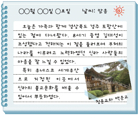 '오늘은 가족과 함께 경상북도 경주 토함산에 있는 절에 다녀왔다'는 내용이 나와 있다. 이어 '8세기 중엽 김대성이 조성했다고 전해지는 이 절을 둘러보며 부처의 나라를 이루려고 노력하였던 신라 사람들의 마음을 잘 느낄 수 있었다. 특히 유네스코 세계 유산으로 지정된 이곳에서 신라의 불교문화를 배울 수 있어서 뿌듯하였다'는 내용이 나와 있다. 마지막으로 '청운교과 백운교'가 사진과 함께 제시되어 있다. 이를 통해 주어진 자료[일기]의 소재가 된 절은 불국사임을 알 수 있다.
