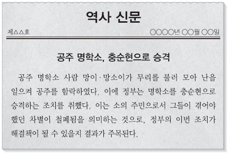 '공주 명학소, 충순현으로 승격'이라는 제목 아래 '공주 명학소 사람 망이·망소이가 무리를 불러 모아 난을 일으켜 공주를 함락하였다'는 내용이 나와 있다. 이어 '이에 정부는 명학소를 충순현으로 승격하는 조치를 취했다. 이는 소의 주민으로서 그들이 겪어야 했던 차별이 철폐됨을 의미하는 것으로, 정부는 이번 조치가 해결책이 될 수 있을지 결과가 주목된다'는 내용이 나와 있다. 망이(?~?)·망소이(?~?)가 공주 명학소에서 봉기한 것은 무신 정권기이자 고려 명종 6년인 1176년의 일이다(망이·망소이의 난 또는 공주 명학소의 난).