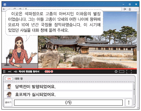'이곳은 석파정으로 고종의 아버지인 이하응의 별장이었습니다. 그는 아들 고종이 12세의 어린 나이에 왕위에 오르자 10여 년간 국정을 장악하였습니다. 이 시기에 있었던 사실을 대화 창에 올려 주세요'라는 질문이 나와 있다. 이어 대화 창에 '당백전이 발행되었어요' 와 '호포제가 실시되었어요'라는 내용이 차례로 제시되어 있다. 참고로 석파정은 현재 서울 종로구에 위치해 있다.