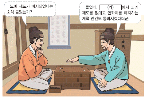 왼쪽 말풍선에 '노비 제도가 폐지되었다는 소식 들었는가?'라는 말이 나와 있다. 이어 오른쪽 말풍선에는 '들었네. (가)에서 과거 제도를 없애고 연좌제를 폐지하는 개혁 안건도 통과시켰다더군'이라는 말이 나와 있다. 이를 통해 '(가)는 제1차 갑오개혁을 이끈 최고 정책 결정 기구인 군국기무처를 가리킴을 알 수 있다(1894.6.25~12.17).