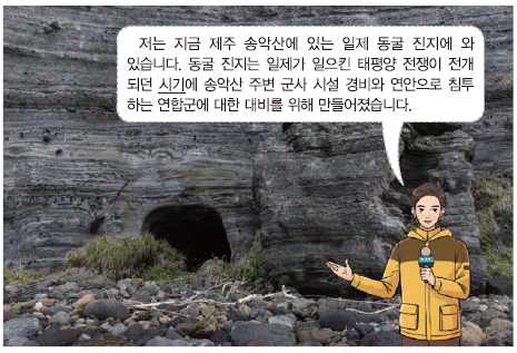 '저는 지금 제주 송악산에 있는 일제 동굴 진지에 와 있습니다. 동굴 진지는 일제가 일으킨 태평양 전쟁이 전개되던 시기에 송악산 주변 군사 시설 경비와 연안으로 침투하는 연합군에 대한 대비를 위해 만들어졌습니다'는 내용이 나와 있다. 이를 통해 주어진 자료 속 밑줄 그은 '시기'는 일제 강점기 말을 가리킴을 알 수 있다.