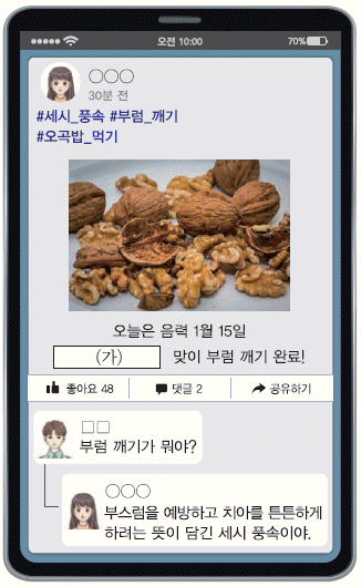 '오늘은 음력 1월 15일 (가) 맞이 부럼 깨기 완료!'가 호두 사진과 함께 제시되어 있다. 이어 '부럼 깨기가 뭐야?'라는 질문에 '부스럼을 예방하고 치아를 튼튼하게 하려는 뜻이 담긴 세시 풍속이야'라는 답이 나와 있다. 이를 통해 주어진 자료 속 '(가)'는 정월 대보름을 가리키는 것임을 알 수 있다. 대보름 때는 호두와 땅콩 등 부럼 깨기는 물론 건강과 풍년을 기원하는 오곡밥, 여름 더위를 막아주는 묵은 나물, 달콤한 꿀을 넣은 약밥 등을 세시 음식으로 먹었다.