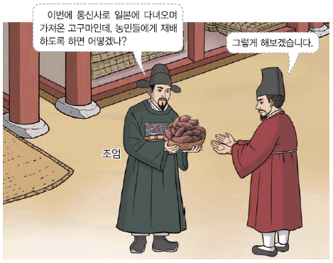 왼쪽 말풍선에 '이번에 통신사로 일본에 다녀오며 가져온 고구마인데, 농민들에게 재배하도록 하면 어떻겠나?'라는 조엄의 말이 나와 있다. 이어 오른쪽 말풍선에는 '그렇게 해보겠습니다'는 대답이 나와 있다. 일본에 통신사로 갔던 문신 조엄(1719~1777)이 고구마의 종자를 얻어 가지고 온 것은 조선 영조 39년인 1763년의 일이다(조선 후기).