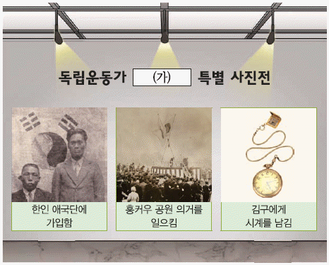 '독립운동가 (가) 특별 사진전'이라는 제목 아래 '한인 애국단에 가입함', '훙커우 공원 의거를 일으킴', '김구에게 시계를 남김'이라는 내용이 사진과 함께 차례로 제시되어 있다. 이를 통해 주어진 자료 속 '(가)'에 들어갈 인물은 매헌 윤봉길(1908~1932)임을 알 수 있다. 윤봉길은 한인 애국단원으로, 1932년 4월 29일 중국 상하이 훙커우 공원에서 폭탄을 투척한 독립운동가이다.