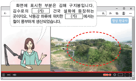 '화면에 표시된 부분은 김해 구지봉입니다'는 내용이 나와 있다. 이어 '김수로의 (가) 건국 설화에 등장하는 곳이지요. 낙동강 하류에 위치한 (가)에서는 철이 풍부하게 생산되었습니다'는 내용이 나와 있다. 가락국, 즉 금관가야의 시조인 김수로왕(재위 42-199)이 나온 것으로 보아 주어진 자료 속 '(가)'는 금관가야를 가리킴을 알 수 있다.