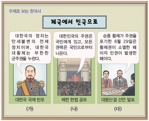 '제국에서 민국으로'라는 제목 아래 말풍선 (가)에 '대한국의 정치는 만세불변의 전제 정치이며, 대한국 대황제는 무한한 군주권을 누린다'는 내용이 나와 있다. 우리나라 최초의 근대적 헌법인 대한국 국제가 반포된 것은 고종 36년이자 광무 3년인 1899년 8월의 일이다(1899.8.17). 이어 말풍선 (나)에는 '대한민국의 주권은 국민에게 있고, 모든 권력은 국민으로부터 나온다'는 내용이 나와 있다. 제헌 헌법이 공포된 것은 대한민국 정부 수립 직전인 1948년 7월 17일의 일이다(제헌절). 마지막으로 말풍선 (다)에는 '순종 황제가 주권을 포기한 8월 29일은 황제권이 소멸한 때이자 민권이 발생한 때이다'는 내용이 나와 있다. 중국 상하이에서 신규식·신채호·조소앙 등 14인의 명의로 주권 재민 사상을 담은 대동단결 선언(문)이 발표된 것은 1917년 7월의 일이다. 국민 주권론을 제기하였고, 정부 수립 의지를 천명하였다. 선언(문)은 본문과 제의(提議)의 강령 7개항, 선언 일자와 서명자, 그리고 찬동통지서와 회신 설명 등으로 이루어졌다.