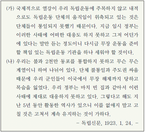 - (가), (나) - 국민 대표 회의에서 서로 대립하였다.