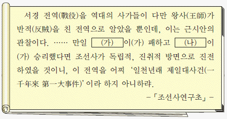 - ④ (나) - 국왕을 황제라 칭하고 준풍을 연호로 사용할 것을 주장하였다.