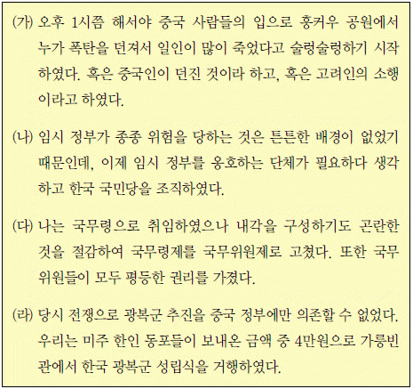 [과목 구분 없음] 다음은 김구의 백범일지 중 일부 내용이다. (가) ~ (라)를 시기 순으로 옳게 나열한 것은? [2점]