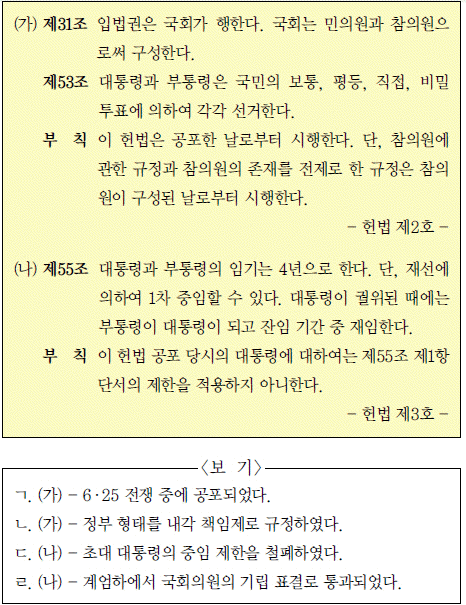 [과목 구분 없음] (가), (나) 헌법에 대한 설명으로 옳은 것을 <보기>에서 고른 것은? [3점]