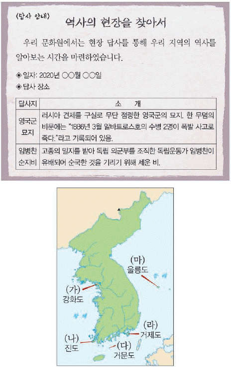 다음 답사가 이루어진 지역을 지도에서 옳게 찾은 것은? [1점]