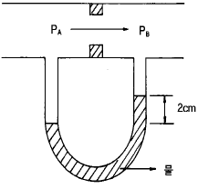그림과 같이 공기가 흐르는 관에서 압력 PA와 PB의 압력차는? (단, 물의 비중량은 1000kg/m3이며, 공기의 비중량은 무시한다.)