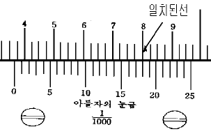최소측정값이 1/1000인치인 버니어 캘리퍼스의 아래 그림의 측정값은 얼마인가?