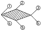 그림과 같이 초음속 흐름에 수평으로 놓인 다이아몬드형 날개골에서 발생하는 팽창파의 위치는?