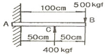 [그림]과 같은 외팔보의 자유단에 500kgf, 중앙점에 400kgf 의 하중이 작용할 때 고정단 A 점의 굽힘 모멘트는 몇 kgfㆍcm 인가?