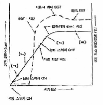일반적인 가스터빈기관의 시동시 시간에 따른 기관 회전 수 및 배기가스 온도를 나타낸 그래프에서 시동기가 꺼진 곳은?