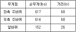 항공기 무게 측정 결과가 다음과 같다면 자기무게의 무게중심의 위치는? (단, 8G/L(G/L 당 7.5lbs)의 오일이 –30in 의 거리에 보급되어 있다.)(오류 신고가 접수된 문제입니다. 반드시 정답과 해설을 확인하시기 바랍니다.)