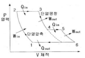 [그림]과 같은 이론공기 사이클을 갖는 엔진은? (단, Q는 열의 출입, W는 일의 출입을 표시한다.)