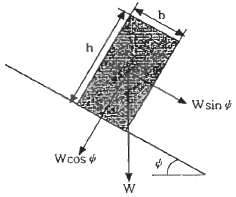 [암석역학] 다음 그림과 같이 경사면 상부에 암석 블록이 놓여있을 때, 점착력을 무시하고 마찰력에 의해서만 블록이 지지된다고 가정하면 이 암석 블록이 안정하기 위한 조건은 무엇인가? (단, 암석 블록의 높이와 폭은 각각 h, b이고, 블록저면과 사면의 마찰각은 ø, 그리고 사면 경사각은 Ψ이다.)