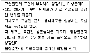 생태계의 생물적 요소 중 유기물을 스스로 합성할 수 없으며, 생산자나 소비자의 생체, 사체와 배출물을 에너지원으로 하여 무기물을 생성하고 용존산소를 소비하는 분해자로, 일반적으로 유기물과 영양물질이 풍부한 환경에서 잘 자라며, 물질순환과 자정작용에 중요한 역할을 하는 종으로 가장 적합한 것은?